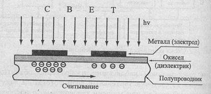 В начале 70-х годов был открыт и реализован новый принцип построения безвакуумных, твердотельных преобразователей «свет – электрический сигнал», так называемых приборов с зарядовой связью (ПЗС). В основу таких приборов положены свойства структуры металл-окисел-полупроводник, называемой МОП-структурой (рис. 3.25).