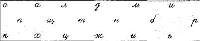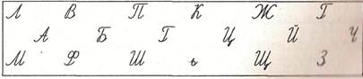 Логопед: Рассмотрите таблицы букв (вывешиваются на доске) и найдите сходные по начертанию буквы. Запишите их парами.