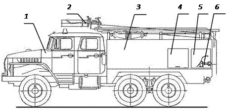 1 – шасси автомобиля Урал; 2 – ствол лафетный; 3 – цистерна; 4 – отсек размещения ПТВ; 5 – насосный отсек; 6 – насосная установка