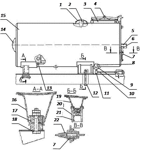 Цистерна закрепляется в трех точках. В передней части опора 16 шарнирная, к ней болтами 18 закреплены амортизаторы 17. В задней части двумя опорами 19 через амортизаторы 20 на брусках 21 цистерна устанавливается на раму и крепится стремянками 12.