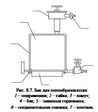 На АЦ нового поколения баки в поперечном сечении имеют форму квадрата с закругленными углами (рис. 8.7). На верхней части бака 4 установлена заливная горловина 5 с присоединенной к ней рукавной головкой 6. Внизу закреплен вентиль 7 для поступления пенообразователя к насосу.