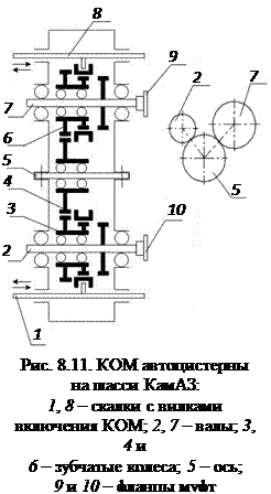 Конструкция КОМ, установленных на ряде пожарных автомобилей, имеет некоторые особенности (рис. 8.9). Ведущий вал 1 соединен с первичным валом коробки передач. На нем закреплена шестерня 10, на которой находится зубчатая муфта 7. На роликовом подшипнике установлено зубчатое колесо 2. С ним в зацеплении постоянно находятся зубчатые колеса 4 и 5. В положении, указанном на рисунке, КОМ выключена. При перемещении штока 11 механизма управления в левую сторону ведущая зубчатая муфта 7 будет соединена с зубчатым колесом 2. Таким образом, крутящий момент будет передаваться зубчатыми колесами 4 и 5 к ведомому валу 6 с муфтой к потребителю. При перемещении штока 11 в правую сторону зубчатая муфта 7 соединит зубчатые колеса 10 и 8. При этом вращающий момент будет подведен к ведущему валу 9 с муфтой и к трансмиссии автомобиля.