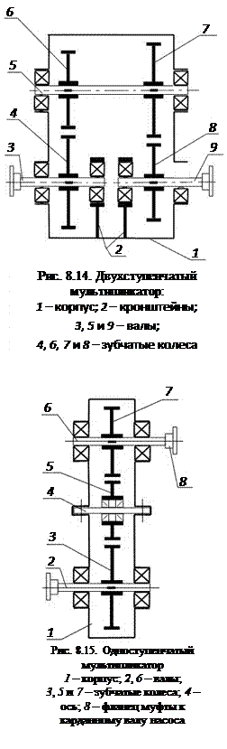 На АЦ с другими типами пожарных насосов в систему привода входит шестеренчатый механизм мультипликатор с паразитным колесом (рис. 8.15). К фланцу муфты на валу 2 присоединяется карданный вал от КОМ, а к фланцу муфты 8 – карданный вал к насосу. Передаточное число механизма равно 1,7. Зубчатые колеса 3 и 7 закреплены на валах 2 и 6 шпонками. Ось 4 закреплена в корпусе 1. Паразитное зубчатое колесо 5 вращается на оси 4.