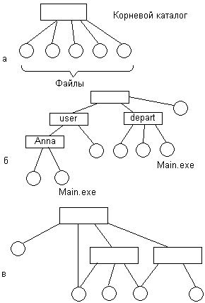 Частным случаем иерархической структуры является одноуровневая организация, когда все файлы входят в один каталог (рис. 7.3, а).