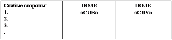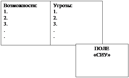 На пересечении разделов образуется четыре поля: поле «СИВ» (силы и возможности); поле «СИУ» (сила и угрозы); поле «СЛВ» (слабость и возможности); поле «СЛУ» (слабость и угрозы).