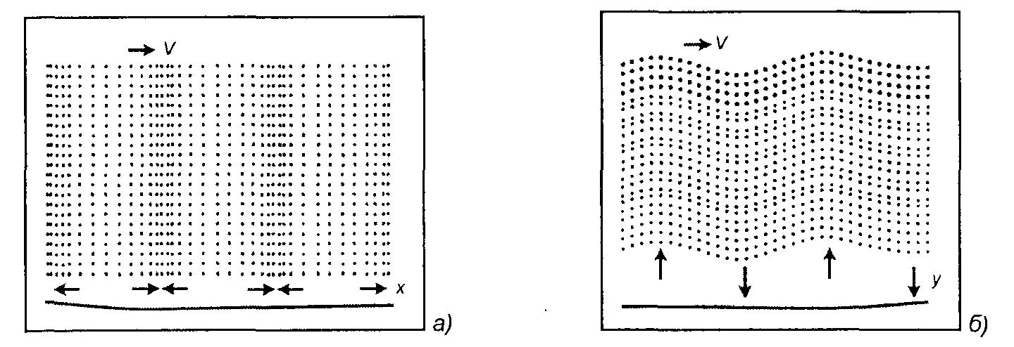 Рис. 2.1. Акустические волны продольного (а) и сдвигового (б) типов
