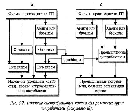 Структура дистрибутивной сети и схемы возможных товаропроводящих цепей зависят от вида производимой готовой продукции и, соответственно, групп потребителей. На рис. 5.2а показаны возможные схемы построения дистрибутивных каналов для предметов потребления, а на рис. 5.26 — для средств производства в соответствии с классификацией продукции.