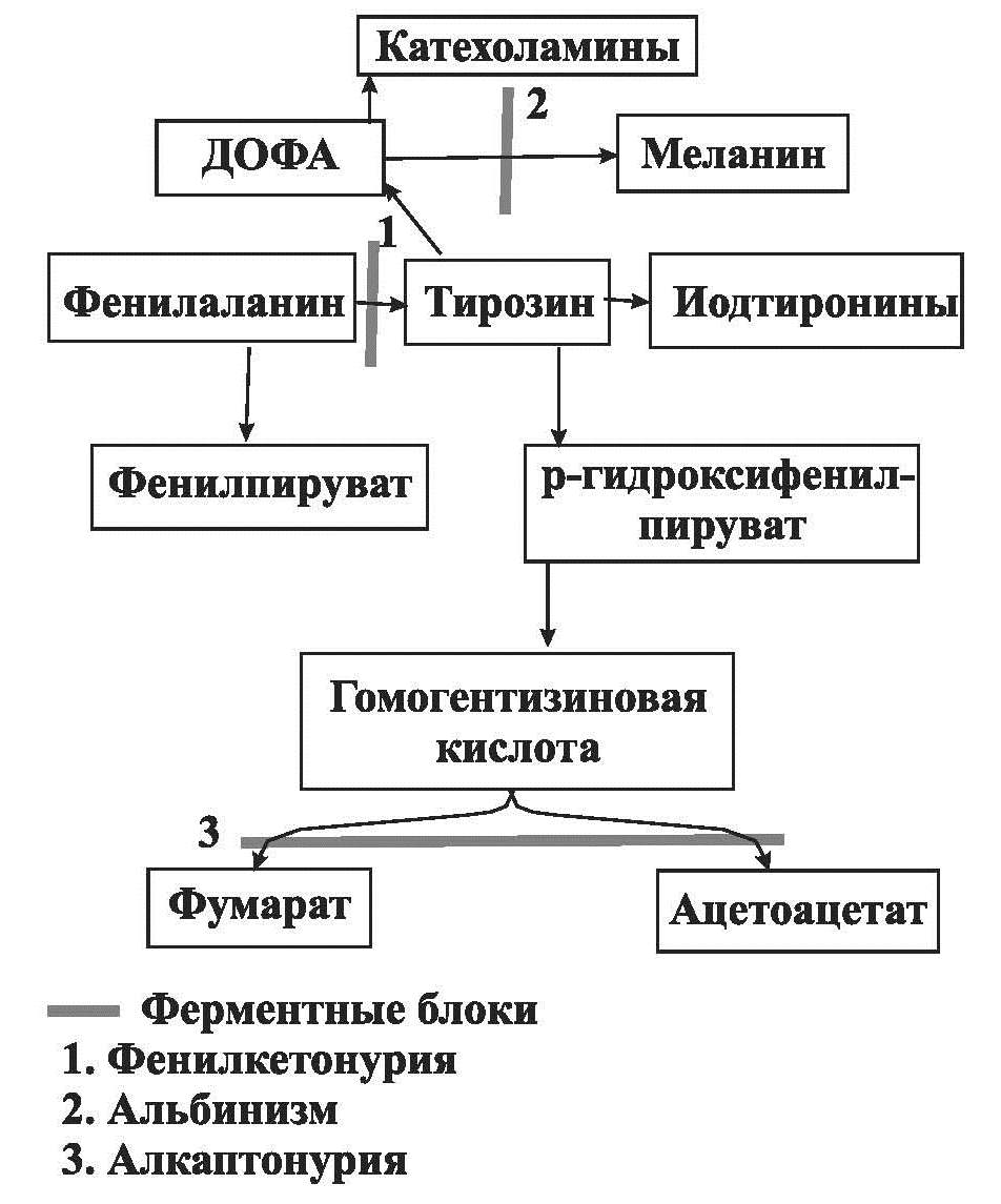 Основное количество фенилаланина (около 80%) превращается в тирозин в результате его гидроксилирования при участии фенилаланингидроксилазы. Реакция протекает с участием НАДФН. Остальная часть фенилаланина подвергается переаминированию и превращается в фенилпируват. При отсутствии фенилаланингидроксилазы образование фенилпирувата становится основным путем катаболизма фенилаланина. Дефект фенилаланингидроксилазы приводит к развитию фенилкетонурии (ФКУ). При этом высокие концентрации фенилпирувата токсически действуют на клетки мозга и нарушают умственное развитие (олигофрения), физическое развитие, может развиться судорожный синдром. Прогрессирующее нарушение умственного развития у детей, больных ФКУ, можно предотвратить диетой – полным отсутствием фенилаланина. При раннем начале такого лечения повреждение мозга снижается или предотвращается. На такой диете ребенок должен находиться до 7-10 лет.