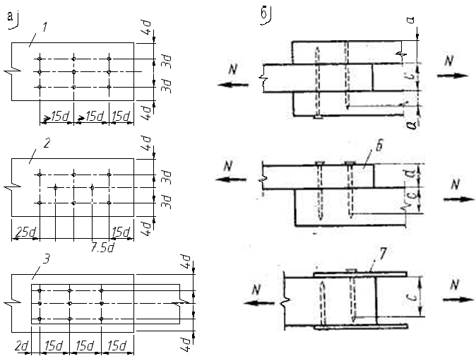 Подбор сечений болтов, и стержней производят из условия, чтобы сумма допускаемых расстояний между продольными осями и до кромок элемента, зависящих от их диаметра, не превышала высоты сечения элемента. Так, например, диаметр болтов d при расстановке в два продольных ряда в элементе высотой сечения h должен быть не более