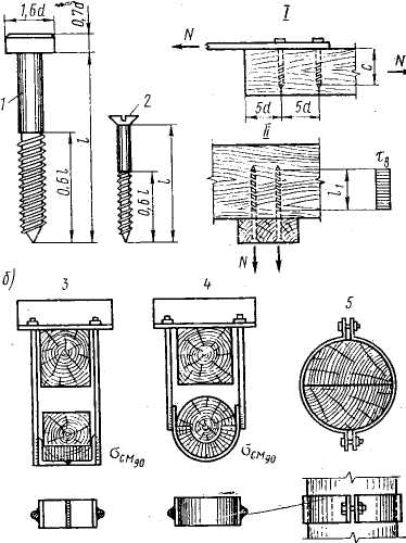 | Рисунок 8 - Винты и хомуты: а — винты; 1 — схема работы изгибаемого винта;II — схема работы выдергиваемого винта; б — хомуты; / — глухарь; 2 — шуруп; 3'— прямой хомут; 4 — полугнутый; 5—гнутый |