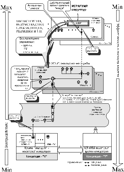 · внедрение своей информации в контуры управления конкурирующего центра циркулярно или через взаимную вложенность структур (осознаваемую и не осознаваемую самими центрами);