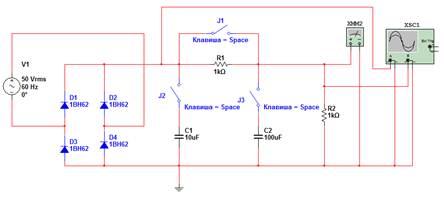 Рис.2 Схема исследования двухполупериодного выпрямителя