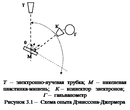 В 1927 году американскими физиками Дэвиссоном и Джермером, а также независимо от них английским физиком Дж. П. Томсоном установлено, что моноэнергетические электроны, падающие параллельным пучком из электронно-лучевой трубки T на никелевую пластинку M (рисунок 3.1), после взаимодействия с ней распределялись в пространстве аналогично тому, как распределено рентгеновское излучение после дифракции на кристалле.