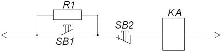 · использование низкого коэффициента возврата (Кв = 0,3¸0,4), что позволяет вводить в цепи самоблокировки «экономические» сопротивления вместо замыкающего контакта реле как показано на рис. 4.1. Электромагнитное реле КА срабатывает при замыкании пусковой кнопки SB1, при отпускании которой катушка реле не обесточивается. По ней проходит ток меньший тока срабатывания, но больший, чем ток отключения реле. Обесточивается катушка реле при нажатии на кнопку SB2. После отпускания этой кнопки по катушке реле проходит ток меньший, чем ток срабатывания реле КА и оно сработать вновь не может;