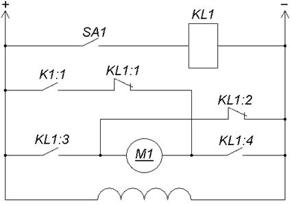 4.5.2.1. Схема блока самоблокировки с промежуточным реле показана на рис. 4.3. Промежуточное реле КL1 срабатывает при нажатии на кнопку SB1 («ПУСК»).