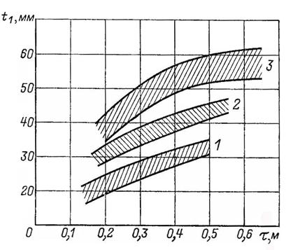 Определив из рис. 2.1 при полученном ранее значении τ максимальное и минимальное значения t1 (1 – для 13–14 габаритов, 2 – для 15–17 габаритов, 3 – для 18–21 габаритов), находят соответствующие им числа пазов (зубцов) машины: