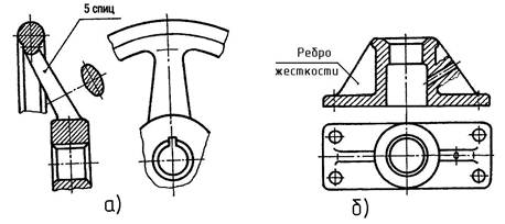 Разрезы штрихуются под углом 450. Однако, если секущая плоскость проходит вдоль спицы маховика (рис. 3.7а) или вдоль тонкой стенки (толщиной до 12 мм) типа «ребра жесткости» (рис. 3.7б), то в разрезе они не штрихуются. При этом сверление в ребре показывают местнымразрезом.