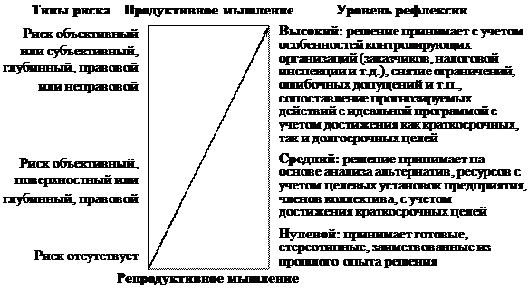 Первый уровень – нулевая рефлексия, отсутствие риска – не отвечает целям и задачам любой организации и не имеет права на существование. Большинство руководителей должно быть способно, принимать решение при высоком уровне рефлексии. При этом руководитель может принять в зависимости от характера внешних и внутренних воздействий на него (экономических, организационных, психологических) практически любой тип рискованного решения.