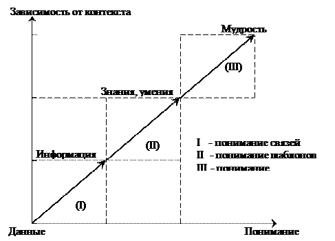 Интеллектуальные ресурсы организаций расширяются в процессе целенаправленного обучения или можно сказать более точно – научения. В этой фразе много неопределённостей. Например, термин «целенаправленное» или термин «научение». Раскрывать их можно по-разному. Разный будет и результат. А результат – это вектор развития (наращивания) интеллектуальных ресурсов. Научение – это вид деятельности и значит, оно имеет свойства и структуру в соответствии с теорией деятельности (Леонтьев А.Н., Выготский Л.С., Лурия А.Р.) и ей свойственны общие признаки, а именно объективно ориентированный характер, опосредованность деятельности, единство внутренней и внешней сторон деятельности, иерархическая структура деятельности со своими мотивами, целями и действиями. Могут быть разные подходы к описанию такой деятельности. Например в модели DIKW (автор Bellinger C.) научение трактуется как «понимание», в процессе которого происходит последовательный переход от «данных» к «информации», затем к «знаниям, умениям» и, наконец, к «мудрости». «Понимание» при этом является первой координатой, а «зависимость от контекста» – второй. При этом при первом переходе происходит понимание связей, при втором – понимание шаблонов, а при третьем – понимание принципов (рис. 5).