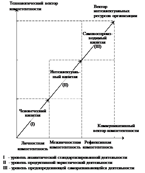 Тогда овладение профессиональной и личностной компетентностью приведёт к формированию первоначального «человеческого капитала», дополнительное научение интеллектуальной и межличностной компетентности позволит сформировать «интеллектуальный капитал», а овладение последними двумя видами компетентности позволит выйти на высший уровень – формирование самовоспроизводимого капитала. Это и будет уровень непрерывно саморазвивающейся организации.