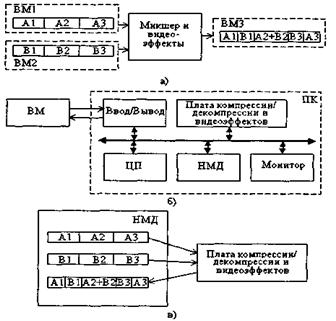 Сначала рассмотрим традиционную схему монтажа на основе видеомагнитофонов (рис. 16.12,а). Исходные видеоматериалы в аналоговой или цифровой формах записаны на видеокассеты и воспроизводятся видеомагнитофонами ВМ1 и ВМ2 (источников монтируемых видеоматериалов может быть и больше). Видеосигналы поступают на устройство, выполняющее функции микшера и формирователя видеоэффектов. Полученный в результате монтажа видеосигнал записывается на видеомагнитофон ВМЗ. Система содержит также не показанные на рисунке мониторы для контроля воспроизводимых и записываемых видеопрограмм.