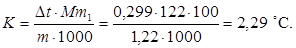 Решение. Повышение температуры кипения ∆t = 46,529 – 46,3 = 0,229 °С. Грамм-молекула бензойной кислоты 122 г. Из формулы (1) находим эбуллиоскопическую константу: