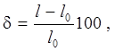 Относительным удлинением δ называется отношение абсолютного удлинения, т. е. приращения расчетной длины образца после разрыва (l – l0), к его первоначальной расчетной длине l0, выраженное в процентах:
