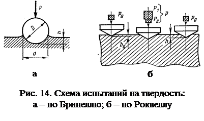 Метод Бринелля. В плоскую поверхность металла вдавливается стальной закаленный шарик диаметром 10; 5 или 2,5 мм (рис. 14, а). После снятия нагрузки в металле остается отпечаток (лунка). Диаметр отпечатка d измеряют специальным микроскопом с точностью 0,05 мм. На практике пользуются специальной таблицей, в которой каждому диаметру отпечатка соответствует определенное число твердости НВ.