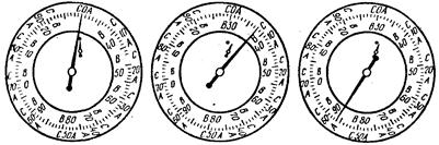 Шарик и конус вдавливаются в металл нагрузкой 60, 100 или 150 кг. Отсчет результатов измерений определяется по показанию стрелки на шкале индикатора твердомера (рис. 15, а). После включения нагрузки стрелка перемещается по шкале индикатора твердомера (рис. 15, б) и указывает значение твердости (рис. 15, в).