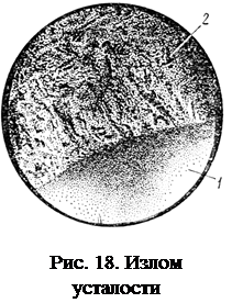 Пораженная трещиной часть сечения детали не несет нагрузки, и она перераспределяется на оставшуюся часть, которая непрерывно уменьшается, пока не произойдет мгновенное разрушение. Таким образом, для усталостного излома характерно, как минимум, наличие зоны прогрессивно растущей трещины 1 и зоны долома 2 (рис. 18).