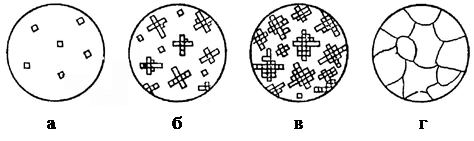 Переход металла из жидкого состояния в твердое называется первичной кристаллизацией. В 1878 г. великий русский ученый Д. К. Чернов, изучая структуру литой стали, установил, что процесс кристаллизации следует разделять на две стадии: зарождение первичных зародышей кристаллов (центров кристаллизации) и рост кристаллов из этих центров (рис. 1).