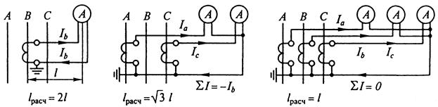 где ρ – удельное сопротивление материала провода. Для алюминиевых проводов ρал = 0,0283 Ом·мм2/м; медных – ρм = 0,0175 Ом·мм2/м (для подстанций с высшим напряжением 220 кВ и выше); lрасч– расчетная длина, зависящая от схемы соединения трансформатора тока. Возможные схемы соединения трансформаторов тока приведены на рис. 4.1.
