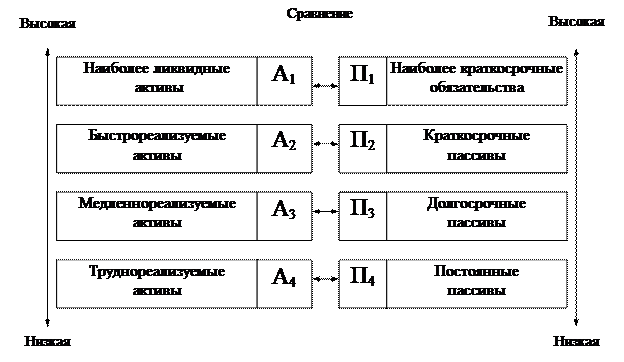 Для проведения анализа активы группируются по степени убывания ликвидности и пассивы баланса по степени срочности оплаты (рис. 4).