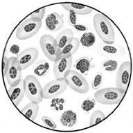 Изучите при малом увеличении микроскопа микропрепарат крови лягушки. Обратите внимание на размер и форму эритроцитов, на эозинофилы (лейкоциты с крупными ярко-красными гранулами и ядром, состоящим из 2-3 сегментов), на тромбоциты (очень мелкие ядерные клетки, чаще расположенные группами и поэтому напоминающие большую клетку с многочисленными ядрами). Зарисуйте тромбоциты и эритроциты.