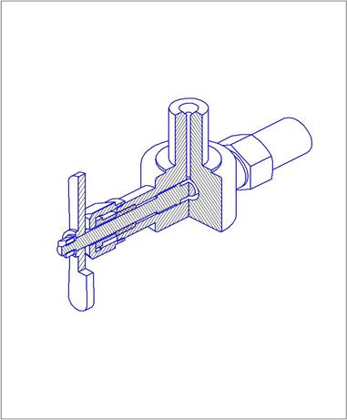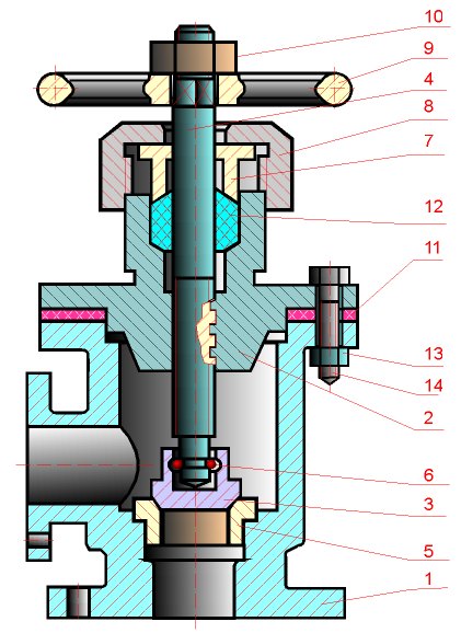 На рис. представлен чертеж общего вида вентиля в разрезе. Номера позиции указывают на детали , из которых состоит вентиль. Каждая деталь закрашена разным цветом и заштрихована в разные стороны. На чертеже применены упрощения при изображении резьбовых соединений, отсутствуют другие изображения,стандартные детали и детали не имеющие внутренних поверхностей показаны не рассеченными. Номера позиций стоят вдоль одной вертикальной линии и расположены над горизонтальными полочками, размер которых не превышает 10 мм. Из чертежа наглядно виден состав сборочного узла и способы соединения деталей. Однако, на чертеже отсутствуют размеры и не вполне ясны отдельные поверхности деталей.