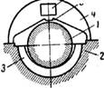 1 — вал, 2 - корпус подшипника. 3 — нижняя половина вкладыша, 4 — скоба. 5 — зазор, измеряемый щупом, 6 — рамка для проставления номера механизма и подшипника (увеличение зазора 5 указывает на наличие износа нижнего вкладыша)