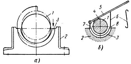 а — ударами по наставке в направлении стрелки, б — при помощи рым-болтов, скоб и рычага; 1 — вал, 2 — корпус подшипника, 3 — нижняя половина вкладыша. 4 — медная подкладка, 5 — рычаг. 6 — длинная скоба. 7 — короткая скоба, 8 — рым-болт