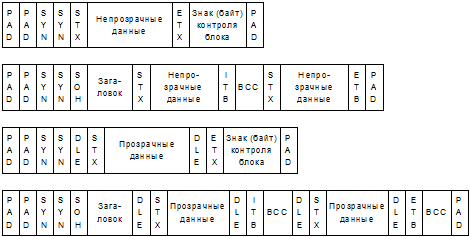 | SYN PAD DLE ENQ SOH STX ITB ETB ETX EOT BCC | Синхронизация канала в состоянии покоя (поддерживает активность канала) Наполнение кадра (временное заполнение между кадрами) Авторегистр 1 (используется для достижения кодовой прозрачности) Запрос (используется с опросом/выбором при захвате) Начало заголовка Начало текста (переводит линию в режим текста) Конец промежуточного блока Конец блока передачи Конец тектса Конец передачи (переводит линию в режим управления) Контрольный счетчик блока |