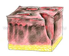IY степень ожогов самая тяжелая, поскольку гибнет не только собственно кожа, но и ниже расположенные ткани – подкожно – жировая клетчатка, мышцы и кость. Образуется струп различной толщины, коричневого или черного цвета, участки некроза тканей. В прилегающих тканях возникают явления стаза крови, повышается проницаемость капилляров, истечение плазмы в ткани, что обусловливает их отек. В клинике не наблюдается ожог костей, т.к. с такими ожогами дети не выживают.