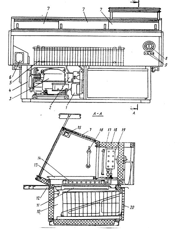 1 – электрощит; 2 – емкость для талой воды; 3 – холодильный агрегат; 4 – машинное отделение; 5 – решетки для упаковочной бумаги; 6 – емкость для протирочного материала; 7 – створки; 8 – ручка термореле; 9 – тумблеры; 10 – охлаждаемый прилавок; 11 – поддон; 12 – полка для сумок; 13 – противень; 14 – испаритель прилавка; 15 – люминесцентная лампа; 16 – термометр; 17 – щиток; 18 – рабочий стол; 19 – испаритель витрины; 20 – выдвижная платформа