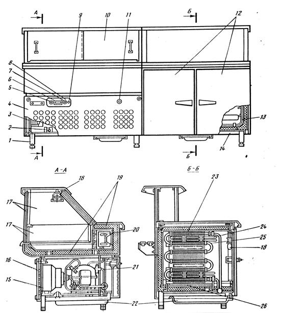 1 – опора; 2 – зажим заземляющий; 3 – панель с электроаппаратурой; 4, 16 – решетки; 5 – переключатель холодильного агрегата; 6 – термометр манометрический; 7 – выключатель лампы освещения витрины; 8 – панель приборная; 9 – лампа сигнальная «оттаивание испарителей»; 10 – створки раздвижные витрины; 11 – термореле РТХО; 12 – двери прилавка; 13 – рама основания; 14 – кассета для функциональных емкостей; 15 – агрегат холодильный; 17 – стекла витрины; 18 – светильники; 19 – теплоизоляция; 20, 25 – испарители; 21 – вентиль терморегулирующий; 22 – поддоны сбора талой воды; 23 – короб прилавка внутренний; 24 – решетки съемные; 26 – лоток для слива талой воды