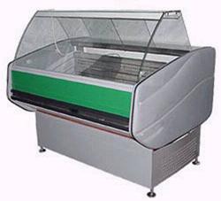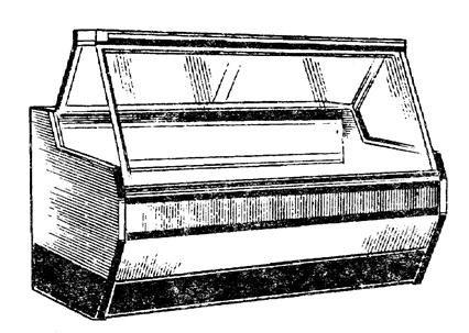Витрина расположена над машинным отделением и отделена от него нержавеющим коробом, который залит теплоизоляцией. Короб и двойной ряд стекол, вставленных в специальный профиль, образуют полезный охлаждаемый объем. В нише короба витрины смонтирован испаритель с защитной решеткой. Талая вода отводится по лотку в поддон прилавка и далее по каналу – в поддон под машинным отделением.