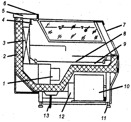 1 – электровентилятор; 2 – теплоизоляция; 3 – испаритель; 4 – решетка нагнетательного воздушного канала; 5 и 8 – полки; 6 – щит управления; 7 – стеклянное ограждение; 9 – всасывающий воздушный канал; 10 – холодильный агрегат; 11 – регулируемые по высоте опоры; 12 – щит электрооборудования; 13 – шланг для слива талой воды