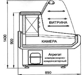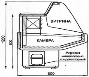 Витрина состоит из машинного отделения и охлаждаемой витрины. Охлаждаемый объем витрины с боков и со стороны покупателей имеет остекление, а со стороны продавца – раздвижные стеклянные створки для доступа в охлаждаемый объем. В нише охлаждаемого объема смонтирован ребристотрубный испаритель, закрытый легкосъемным декоративным ограждением. С наружной стороны ниша и верхняя часть охлаждаемого объема покрыты металлическим листом и образуют рабочий стол продавца и полку. Машинное отделение представляет собой раму-основание, к которой прикреплены облицовочные панели. В машинном отделении смонтирован холодильный агрегат, щит управления с автоматическим выключателем, устройством УЭ-2 для автоматической оттайки испарителя.