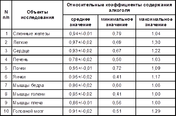 Применяя полученные коэффициенты соотношения содержания в них алкоголя и в крови, можно использовать такие органы и ткани, как слюнные железы, яички, мышцы бедра для количественного определения алкоголя в случаях невозможности использования для этих целей крови с обязательным учетом рекомендованных коэффициентов соотношения содержания алкоголя.