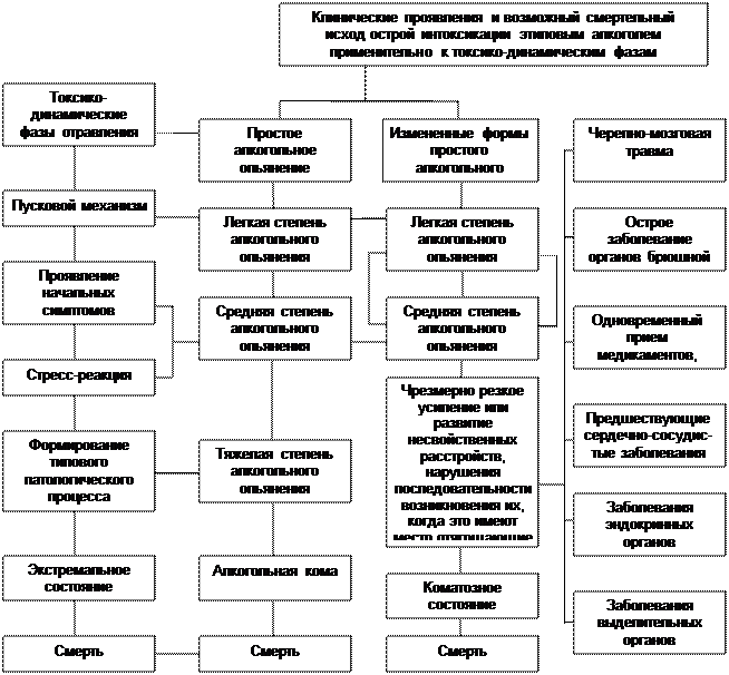 Применительно к токсико-динамическим фазам отравления, с легкой степени простого алкогольного опьянения начинается пусковой механизм. Средняя степень соответствует проявлению начальных симптомов отравления и стресс-реакции, тяжелая – формированию типового патологического процесса, алкогольная кома – экстремальному состоянию.