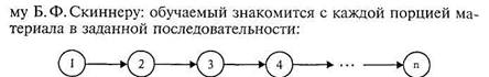 Правильный шаг обучающегося в этой форме обучения подкрепляется, что служит сигналом к дальнейшему выполнению программы. Как свидетельствует В.Оконь, линейная программа в понимании Б.Ф.Скиннера характеризуется следующим: