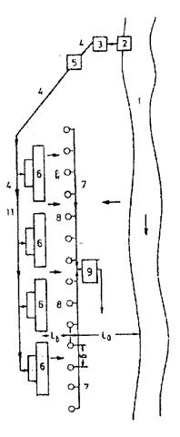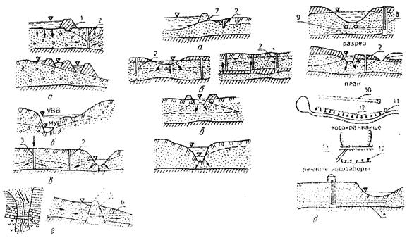 5 – подземная плотина; 6 – самотечный водовод; 7 – земляная плотина; 8 – приемный колодец; 9 – водосборные галереи; 10 – канал; 11 – насосная станция; 12 – скважины;