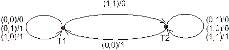 Пример 1. Рассмотрим конечный автомат М, на вход которого поступают последовательно пары компонент двоичных представлений чисел x и y (начиная с младших разрядов), а на выходе последовательно (начиная с младших разрядов) формируется двоичное представление суммы х+y.
