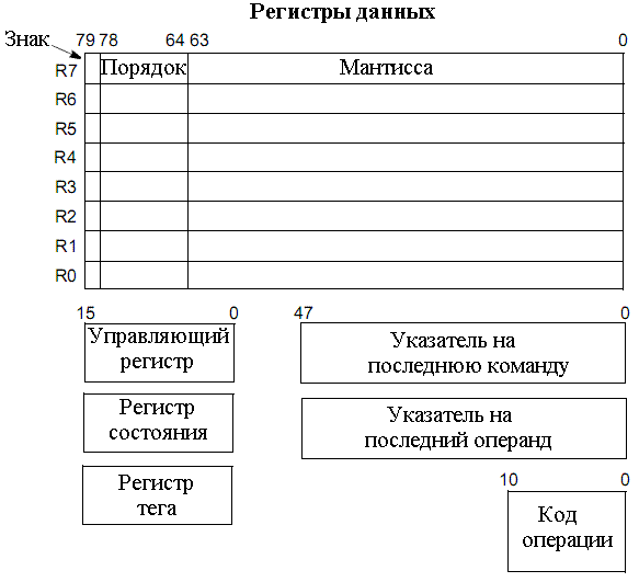 Блок обработки чисел с плавающей запятой имеет свою систему команд и работает со своим набором регистров. При этом, выборку команд для блока FPU осуществляет процессор.